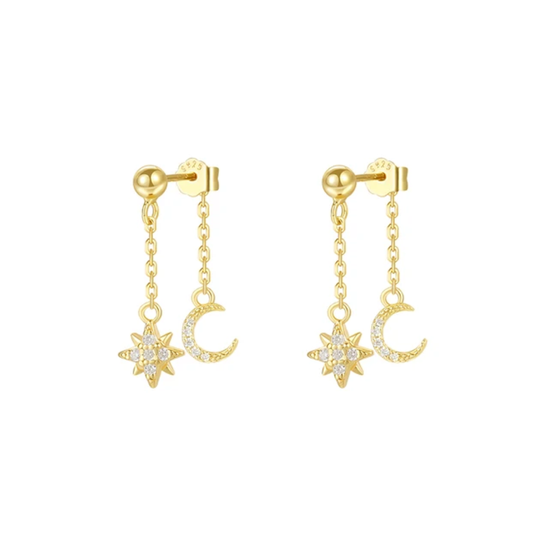 Celest Earrings in 925 sterling silver with gold plating, star & moon motifs with brilliant-cut zircon stones by Dione Canada
