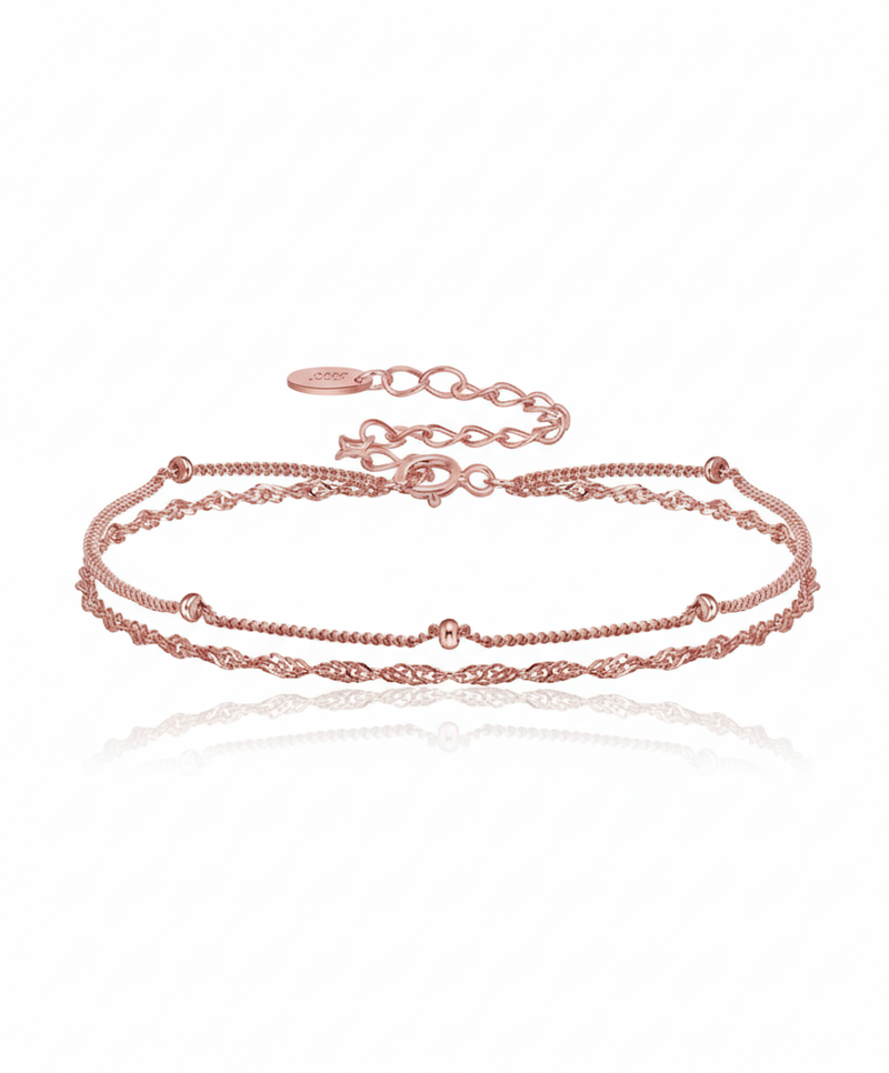 Luna Blush Bracelet — Effortlessly elegant and delicately designed, the Luna Blush Bracelet is crafted from premium 925 sterling silver and plated with luxurious 18K rose gold for a warm, radiant finish. Inspired by Japanese minimalism, its double-layered chain design exudes understated sophistication, making it perfect for daily wear or special occasions. A timeless accessory for women who appreciate subtle elegance and modern charm.